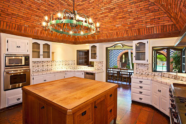 This magnificient kitchen truly is a dream chefs kitchen with is amazing high bricked ceilings giving such a feeling of space. The natural wood block island compliments the cream cabinets of the main kitchen wonderfully. A large range cooker is at the heart of the kitchen for cooking big parties but it also has a built in wall oven & microwave when it for one.